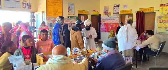 चिरैयाकोट प्राथमिक स्वास्थ्य केंद्र पर सीएम आरोग्य मेला में मरीजों को दवा देते स्वास्थ्यकर्मी।