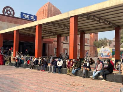 मऊ जंक्शन रेलवे स्टेशन पर धूप आनंद लेते यात्री।संवाद