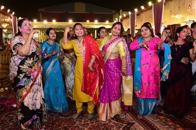 मऊ। जायसवाल समाज के होली मिलन समारोह में महिलाओं ने अबीर गुलाल लगाकर फिल्मी धुनों पर खूब नाचीं और थिरकीं।