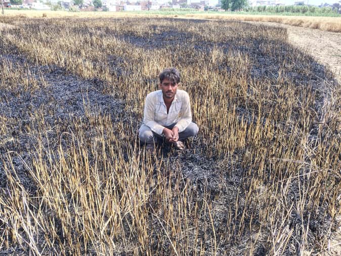 सरूरपुर। गेहूं की खड़ी फसल में आग लगने के बाद खेत में बैठा किसान फरमान। संवाद