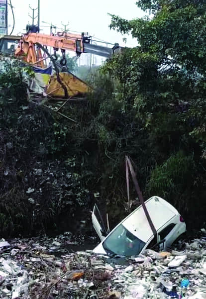 जाग्रति विहार एक्सटेंशन के साउथएक्स पुल के नीचे नाले में गिरी कार को बाहर निकालती क्रेन। स्त्र
