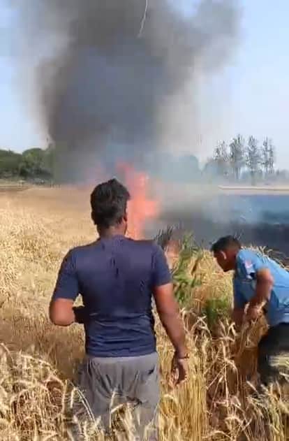 गांव ततीना में गेंहू के खेत में लगी आग को बुझाते हुए। (स्त्रोत किसान) मवाना।