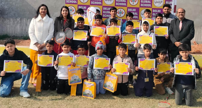 दिल्ली ग्लोबल स्कूल में प्रतियोगिताओं में स्थान प्राप्त करने वाले छात्र छात्राएं। (स्त्रोत संस्
