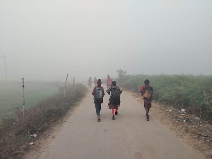 सड़क पर घने कोहरे के बीच स्कूल के लिए जाते स्कूली बच्चे।-संवाद।