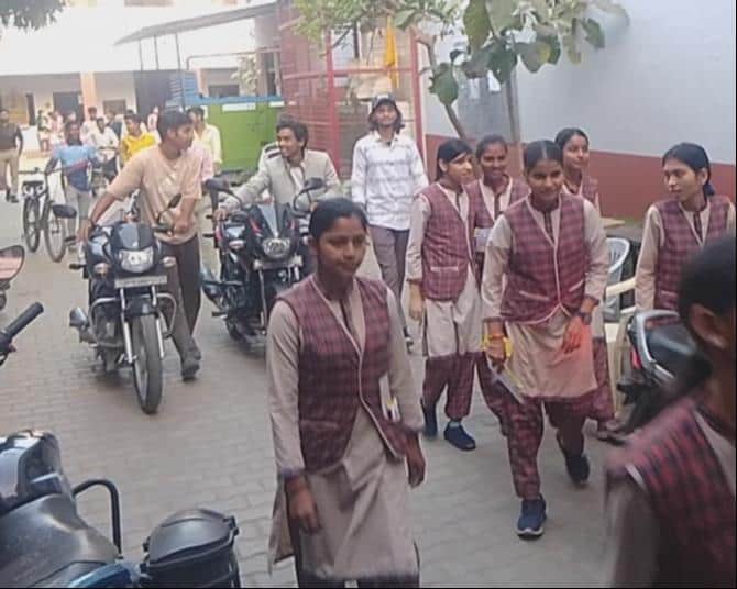नगर के माता प्रसाद माता भीख इंटर कालेज से यूपी बोर्ड की परीक्षा देकर बाहर निकलते छात्र व छात्रा