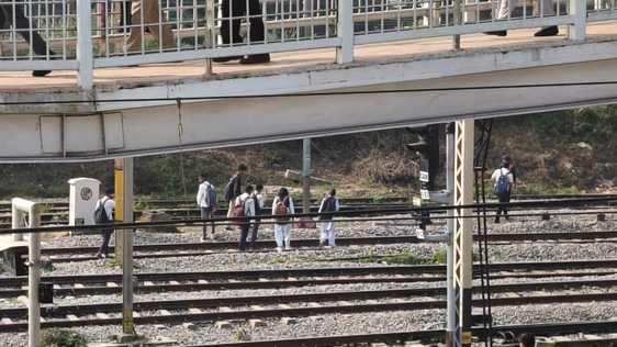 चुनार जंक्शन पर घटना के दूसरे दिन लाइन नंबर सात को पार करते छात्र छात्राएं। फोटो संवाद