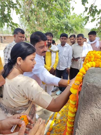 लालगंज के कठवार गांव में उत्सव भवन के लिए शिलान्यास करते छानबे विधायक रिंकी कोल, ब्लॉक प्रमुख