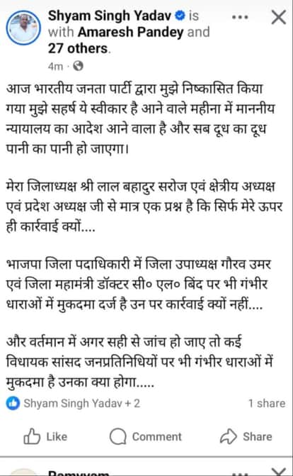 भाजपा में जिला मंत्री के पद से मुक्त किए जाने के बाद श्याम सिंह यादव फेसबुक पर पोस्ट करके जिला कार्यसमिति के नव निर्वाचित कई पदाधिकारियों पर गंभीर आरोप लगाए। कहा कि जिलाध्यक्ष और क्षेत्रीय अध्यक्ष, प्रदेश अध्यक्ष से मात्र एक प्रश्न है कि सिर्फ मेरे ऊपर कार्रवाई क्यों। कई अन्य जिला पदाधिकारियों पर गंभीर धाराओं में प्राथमिकी दर्ज है। इसके बाद भी उन पर कार्रवाई नहीं हुई। जांच कराकर उन पर भी कार्रवाई होनी चाहिए।