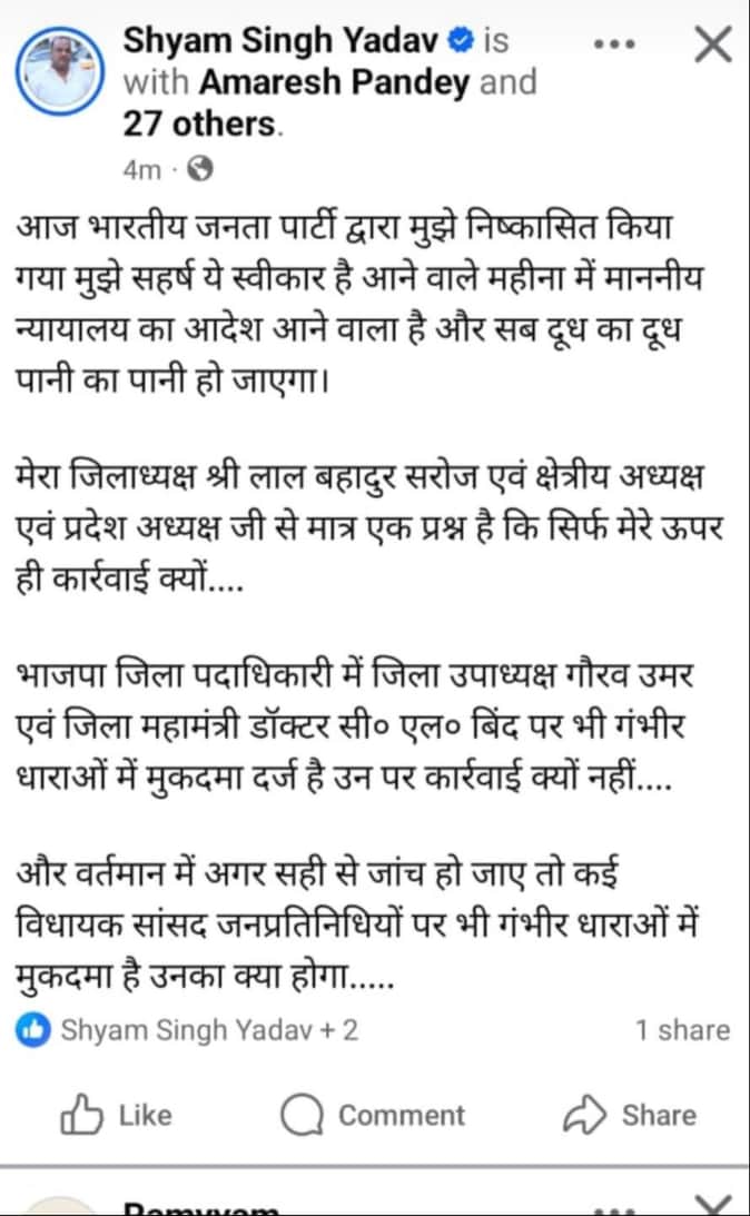 Mirzapur News: भाजपा के जिला मंत्री के पद से हटाए गए श्याम सिंह यादव ने सोशल मीडिया पूछे सवाल