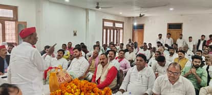 पार्टी नेताओं के साथ बैठक को संबोधित करते जिलाध्यक्ष देवी प्रसाद चौधरी। श्रोत- सपा