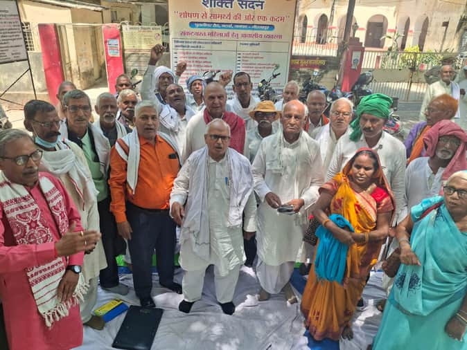 जिला मुख्यालय पर आयोजित सेवानिवृत्त कर्मचारी व शिक्षकों के धरने को संबोधित करते वक्ता, स्रोत
