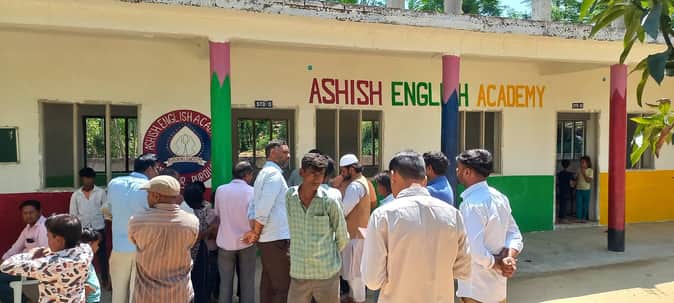 पुरकाजी के गांव झबरपुर में स्कूल में एकत्र ग्रामीण व बच्चों के अभिभावक। संवाद