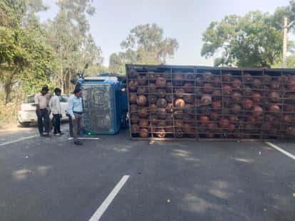 Pilibhit News: कार से टकराकर हाईवे पर पलटी सिलिंडर लदी डीसीएम, लगा जाम