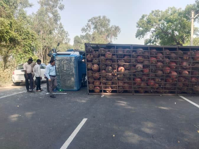 पीलीभीत-पूरनपुर हाईवे पर पलटी गैस सिलिंडर भरी डीसीएम। स्रोत : जागरूक पाठक।