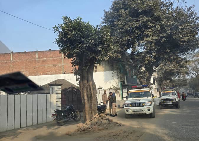 गैंगस्टर के आरोपी के घर के बाहर खड़ी पुलिस। स्रोत सोशल मीडिया