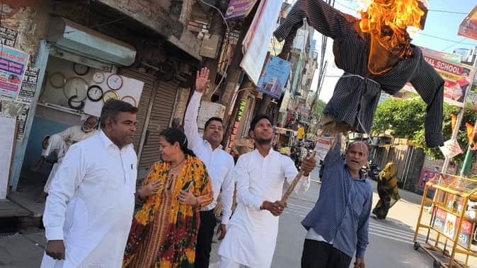 गैस चौराहे पर पुतला फूंकते कांग्रेसी। स्रोत संगठन