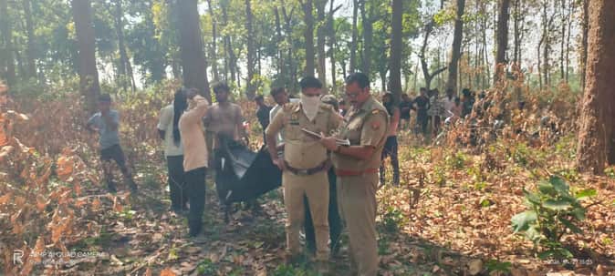 न्यूरिया क्षेत्र के जंगल में शव मिलने पर जांच करती पुलिस। संवाद