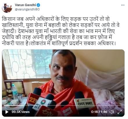 अग्निपथ योजना को लेकर वरुण गांधी लगातार अपनी ही सरकार पर बरस रहे हैं। पीलीभीत से भाजपा सांसद वरुण गांधी ने सोमवार को भगवावेशधारी एक नेता के उस वीडियो पर तीखी प्रतिक्रिया दी है जिसमें भगवावेशधारी नेता जी अग्निपथ योजना की तरफदारी में तर्क दे रहे हैं।