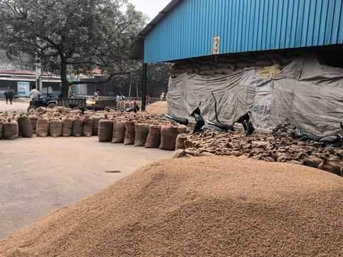 मंडी में टीन शेड-तीन के बाहर खुले में रखा धान। संवाद