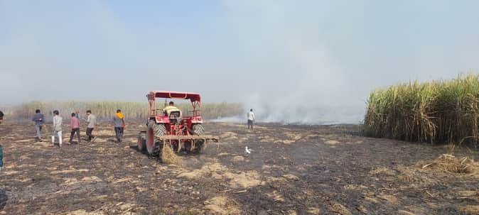 Pilibhit News: गन्ने के खेत में लगी आग से 14 बीघा फसल जली