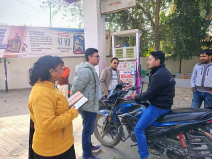 पेट्रोल पंप पर वाहन चालक को यातायात नियमों की जानकारी देते अधिकारी। स्रोत विभाग।