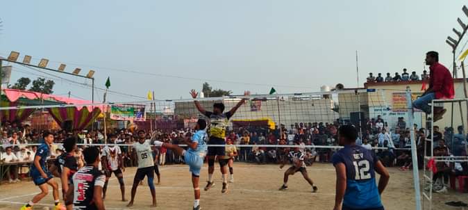 अमरिया क्षेत्र के गांव सरैंदा पट्टी में वॉलीबॉल टूर्नामेंट में मुकाबला करते खिलाड़ी स्रोत -सं