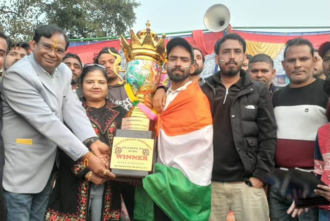 राजा कप क्रिकेट टूर्नामेंट में विजेता आरसीवी न्यूरिया के कप्तान हासिम को ट्रॉफी व पुरस्कार भेंट