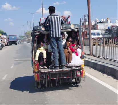 शहर के बरेली मार्ग पर टेंपों पर लटक कर जाते यात्री। संवाद