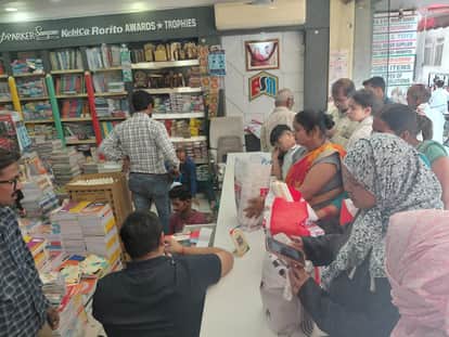 शहर के एक स्टेशनरी दुकान पर कोर्स लेने के लिए अभिभावको की भीड़। संवाद