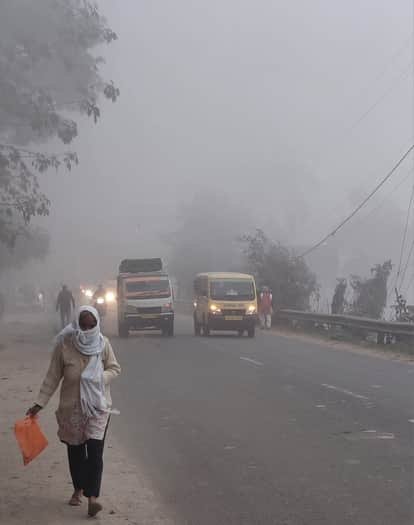 शहर के टनकपुर मार्ग से कोहरे में गुजरते वाहन व राहगीर। संवाद