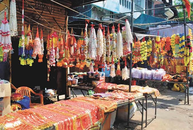नवरात्र की तैयारी में बाबागंज में सजी पूजन सामग्री की दुकान।