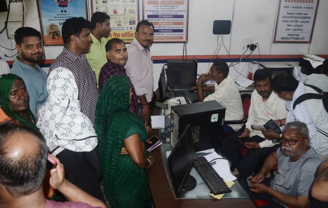गैस एजेंसी पर गैस बुकिंग के लिए काउंटर पर लगी उपभोक्ताओं की भीड़। संवाद