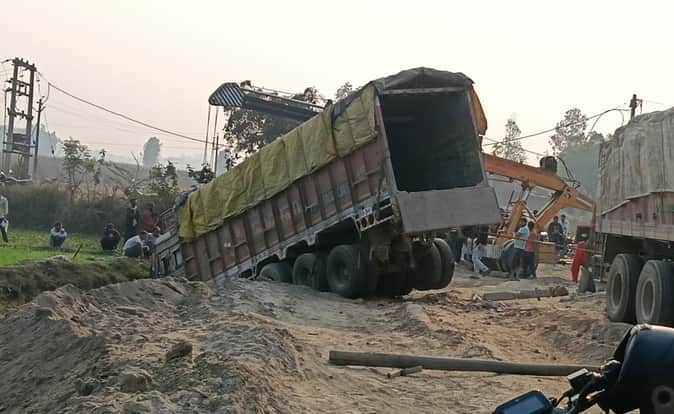 ट्रक अनियंत्रित होकर पुलिया में घुसा, बचे लोग
