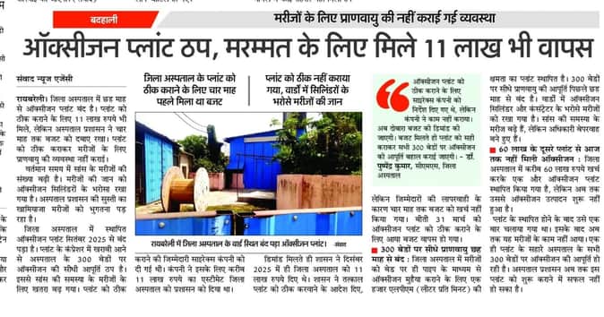 रायबरेली। जिला अस्पताल में छह माह से बेकार पड़े ऑक्सीजन प्लांट को लेकर जिला प्रशासन गंभीर हो गया है। शासन से 11 लाख रुपये मिलने के बाद भी चार माह तक दबाए रखने और बजट के वापस होने के मामले में सीएमएस से जवाब मांगा गया है। इस संबंध में अमर उजाला में खबर प्रकाशित होने के बाद अफरातफरी का माहौल है।