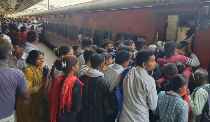 लवे स्टेशन के प्लेटफार्म एक पर ट्रेन में चढ़ने के लिए धक्कामुक्की करते यात्री व अभ्यर्थी।