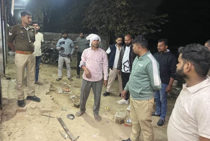 दुकान पर हुई तोड़फोड़ की घटना की जांच करती पुलिस।