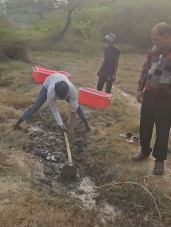 धौरहरा गांव में पकड़ी गई पनीर को नष्ट कराते मुख्य खाद्य सुरक्षा अधिकारी।
