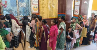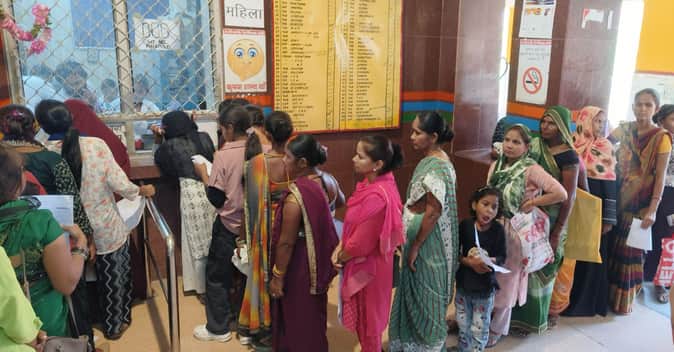 जिला अस्पताल के काउंटर पर दवा लेने के लिए लाइन में खड़ी महिलाएं।