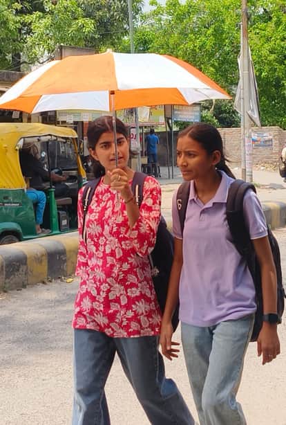 कलेक्ट्रेट रोड पर तेज धूप से बचने के लिए छाता लगाकर जाती छात्राएं।