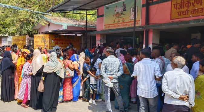 जिला अस्पताल के पंजीकरण काउंटर के बाहर पर्चा बनवाने के लिए लगी भीड़।