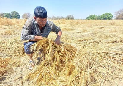 - फोटो : परशदेपुर क्षेत्र में तेज हवा और बारिस के साथ ओले गिरने से भीगी गेहूं की फसल को देखता किसान।