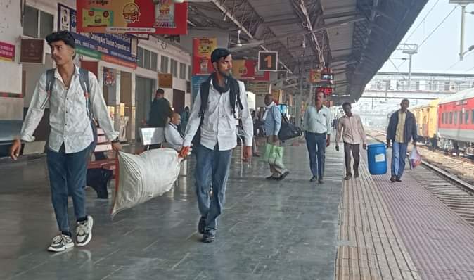 शहर के रेलवे स्टेशन पर ट्रेन का इंतजार करते यात्री।