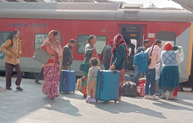 शहर के रेलवे स्टेशन पर ट्रेन से उतरे यात्री।