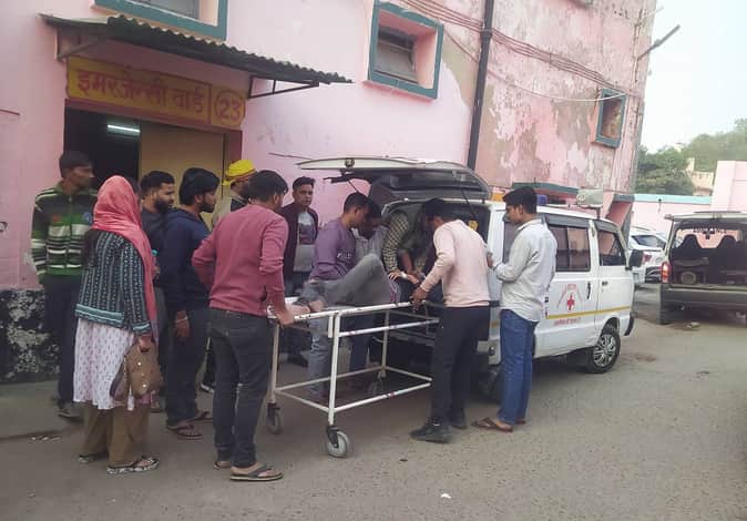 इमरजेंसी वार्ड के गेट पर निजी एंबुलेंस में मरीज को लेकर जाते लोग।