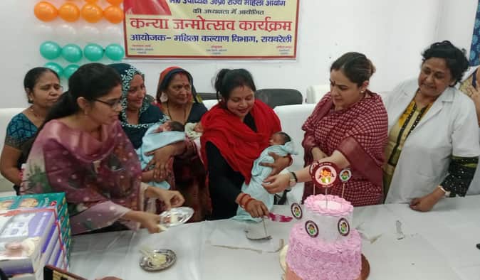 कन्या जन्मोत्सव कार्यक्रम में प्रसूताओं और उनके परिजनों के साथ केक काटतीं राज्य महिला आयोग की उ