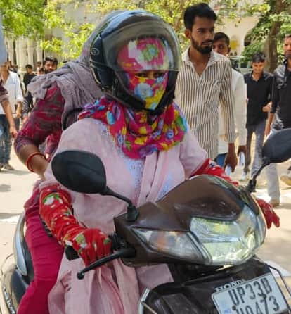 तेज धूप और लू से बचने के लिए चेहरे और शरीर को ढककर स्कूटी से जाती युवती।