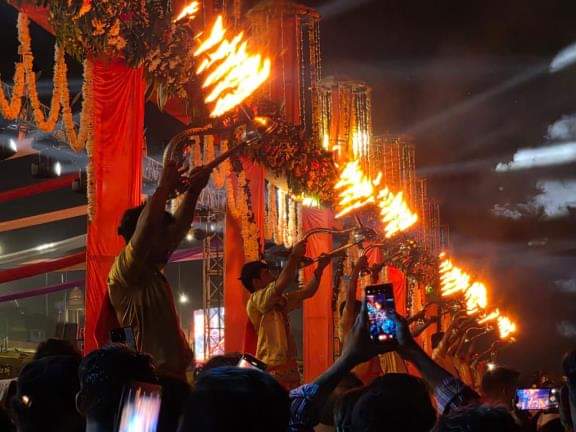 डलमऊ में गंगा की महाआरती करते मठ के शिष्य।