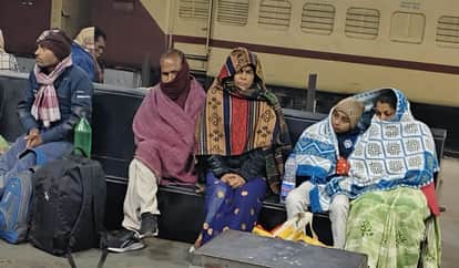 शहर के रेलवे स्टेशन पर सर्दी में ठिठुरते यात्री।