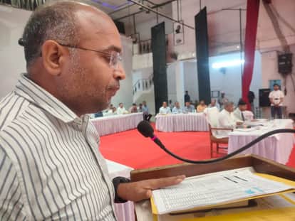नगर निगम की बोर्ड बैठक में बजट पेश करते लेखाधिकारी मनोज त्रिपाठी। स्रोत निगम
