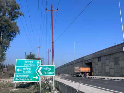 दिल्ली-देहरादून एक्सप्रेसवे पर लगे औरंगजेबपुर के बोर्ड पर पोती गई कालिख। संवाद
